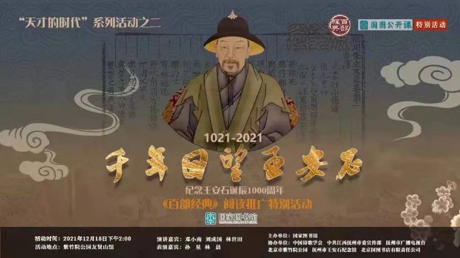 12月18日,正值我国北宋时期政治家、文学家、思想家王安石诞辰1000周年,国图公开课“千年回望王安石——纪念王安石诞辰1000周年”《百部经典》阅读推广特别活动在北京紫竹院公园友贤山馆和江西抚州王安石纪念馆同步举行。本次活动由国家图书馆主办,中国诗歌学会、中共抚州市委宣传部、抚州市广播电视台、北京市紫竹院公园管理处、抚州市王安石纪念馆、北京国图书店有限责任公司协办。国家图书馆馆长熊远明出席活动并致辞。