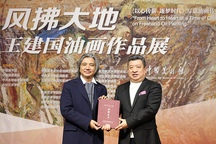 中国美术馆馆长发吴为山向本次展览艺术家王建国颁发收藏证书