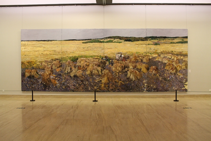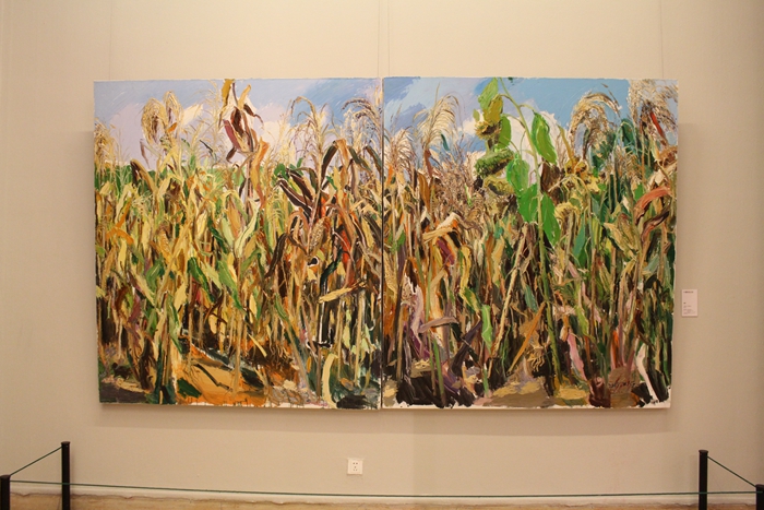 相较于描绘都市情景与秀丽山川,王建国更敢于走向广阔的乡村图景,走向平凡的城镇生活,走向真实的中国大地。走在展厅,如同穿越林海,穿越雪山,穿越历史悠久的老工业基地,来到黑土地上东北人民朴素的聚会。“风拂大地”,王建国的作品便随着风拂过祖国的每一寸土地,触摸脚下的每一寸肌理。林海、厂房、苞米地、向日葵……这些东北大地上最朴素的场景在王建国的笔下重新焕发了生机,向观众展现了中华大地的山河之美,亦展现了寻常而不平凡的东北生活图景和这片土地上勤劳质朴的人民。