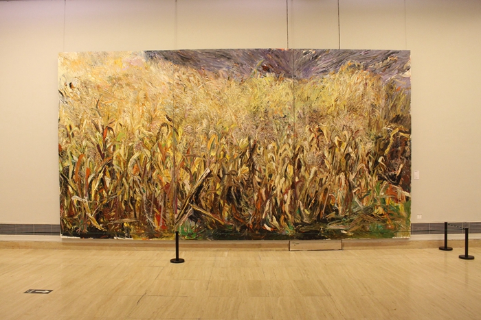 在展厅中,我们可以看到一幅幅尺幅巨大的作品,有些甚至长达6米。如此大尺幅的创作已不是简单的画笔可以完成,王建国在激情盎然的绘画中用了刷子甚至拖布去进行身体力行的劳作,兴致来时,大笔挥就。一层层颜料铺就的厚度,有着东北大地的厚重。粗犷的笔触,厚重的肌理,巨大的尺幅共同构成的画作带给观众以强烈的视觉冲击感。
