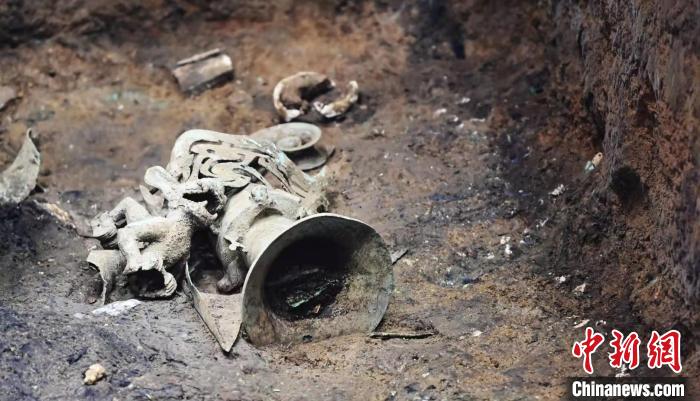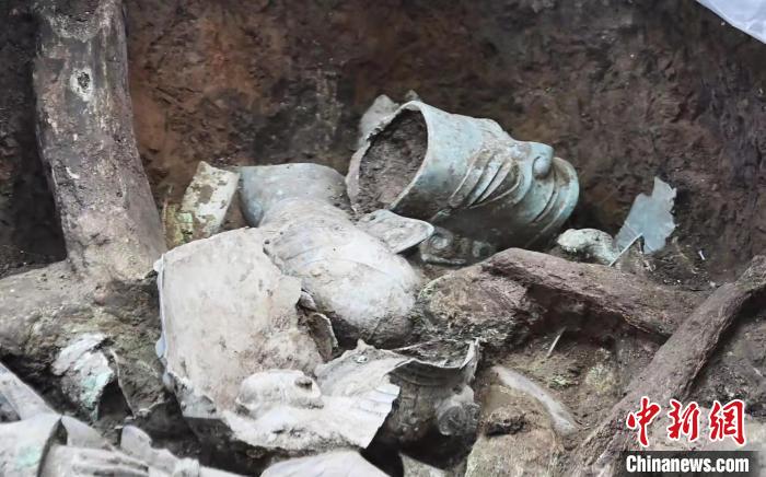 三星堆遗址祭祀坑内待发掘的文物。(资料图) 安源 摄