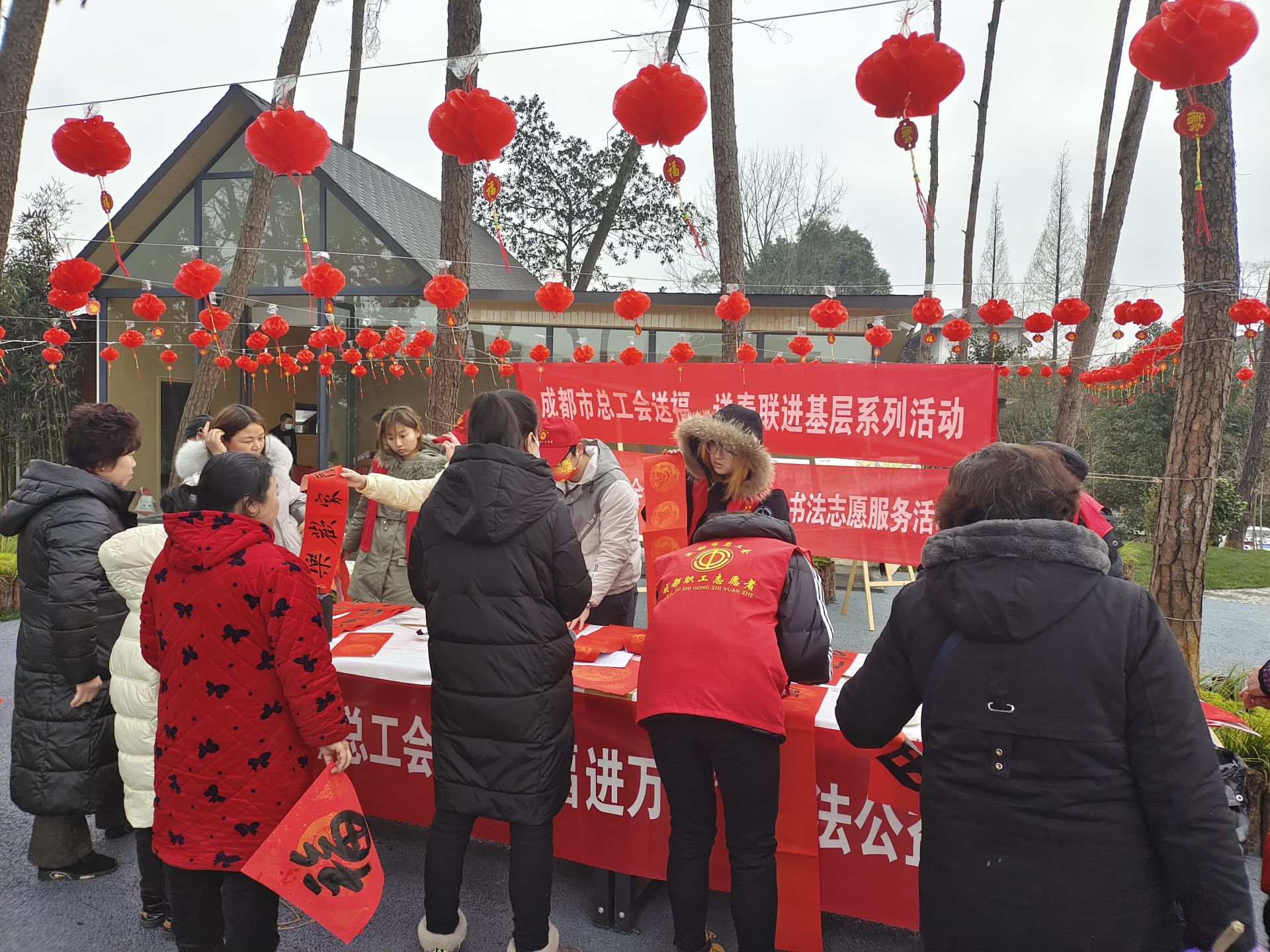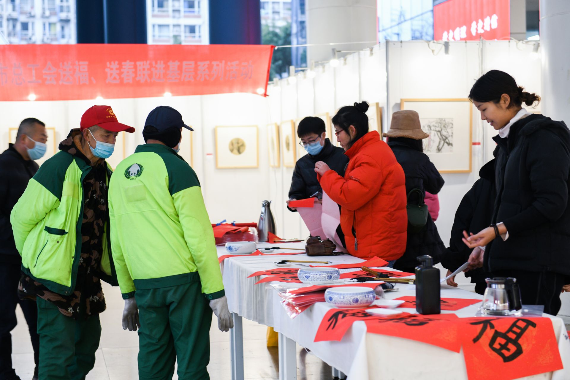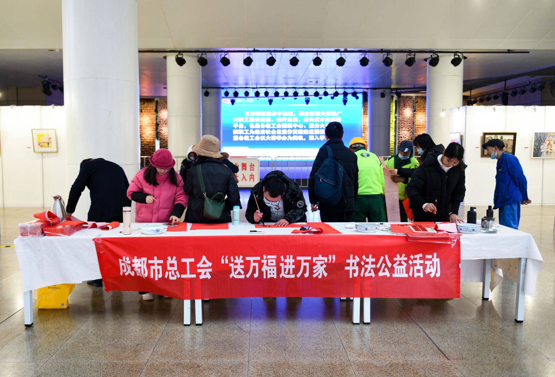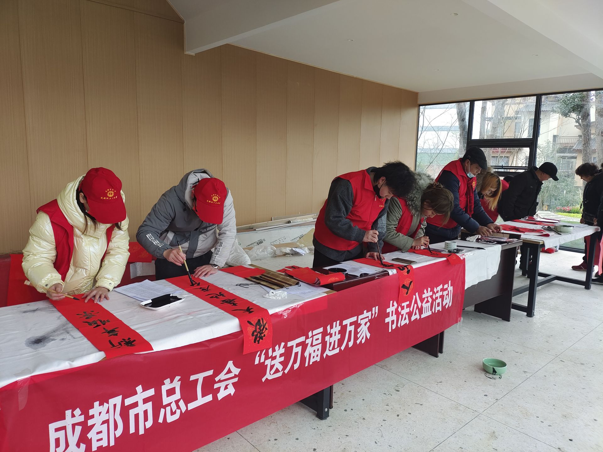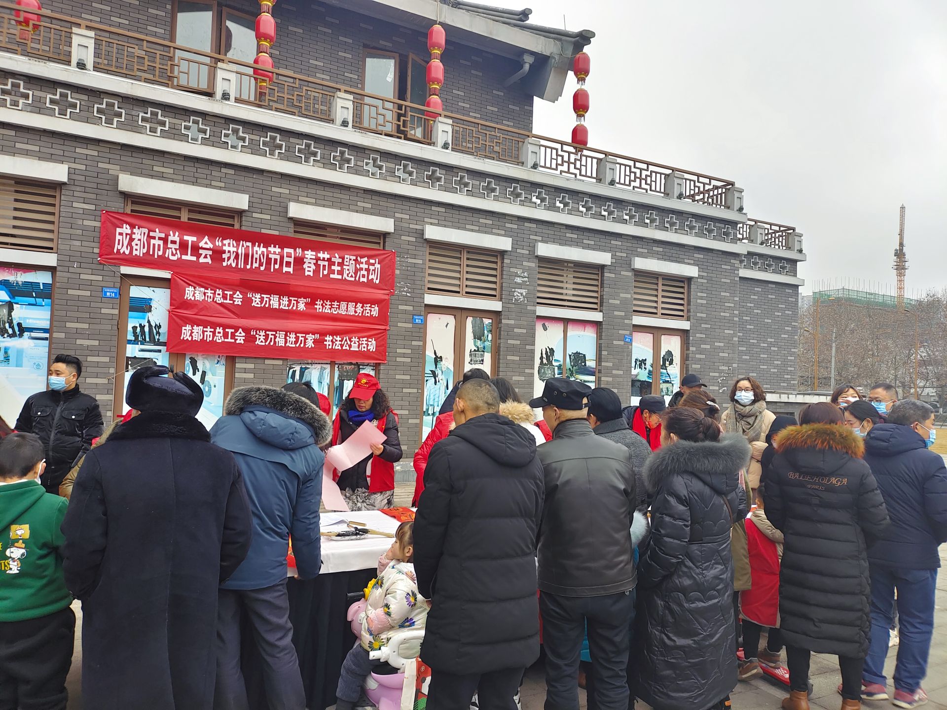 春节作为中华民族最重要的传统节日,蕴含着我国传统文化的精髓,承载着中华民族的民族精神、民族情感和思想精华。为丰富广大人民群众文化生活,营造文化氛围,增添喜乐欢庆的节日气氛,弘扬中国传统文化。2022年新春佳节前夕,成都市总工会组织开展了“迎新春 送温暖” 送文化进基层活动,成都惠民职工画院的书法艺术家们,从1月19日至1月27日,分别来到了社区、乡村、企业,挥毫泼墨,现场书写福字和春联,将美好愿望和祝福送给了当地的职工群众们。