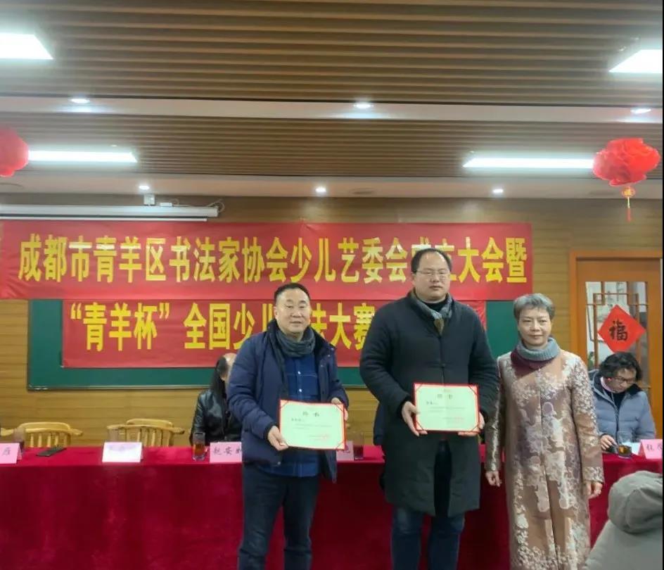 成都市青羊区文联主席夏红艳为少儿艺委会顾问李家德、张雁颁发聘书。