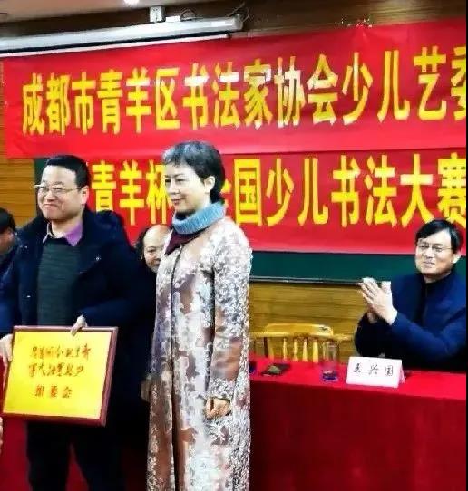 成都市青羊区文联主席夏红艳为少儿艺委会主任霍旺授牌。