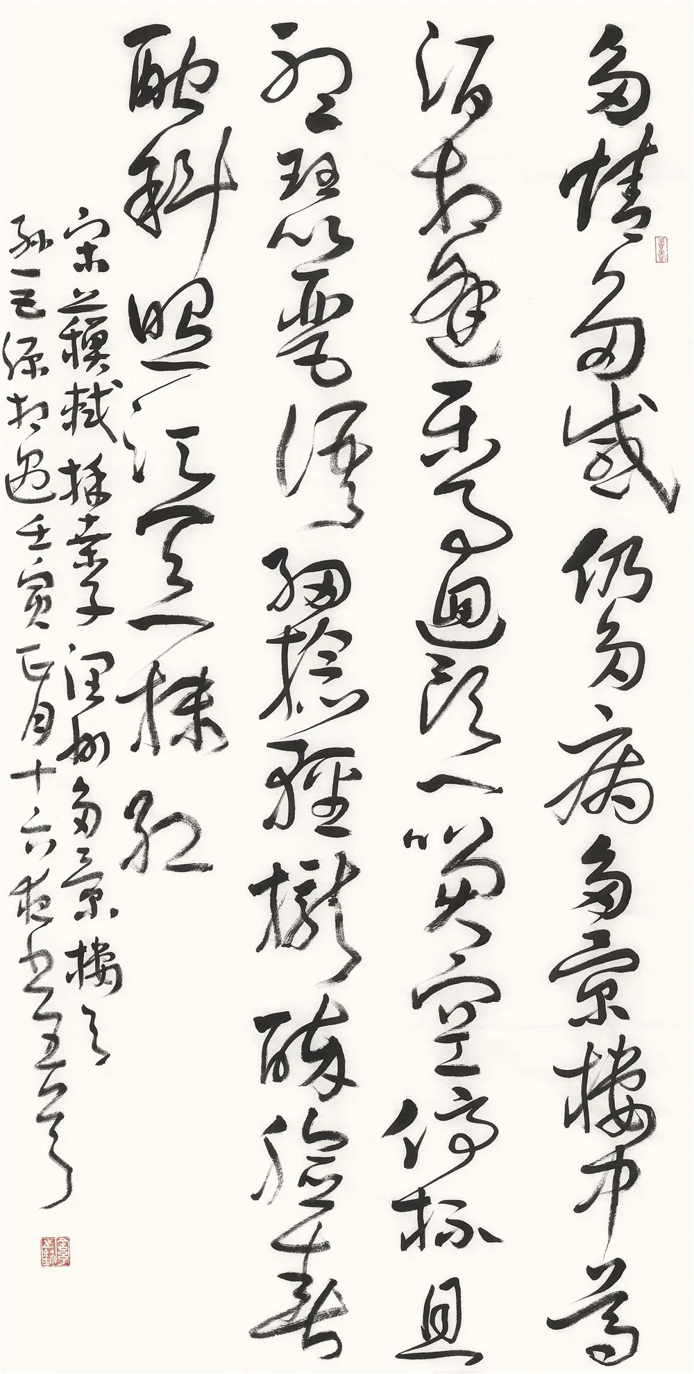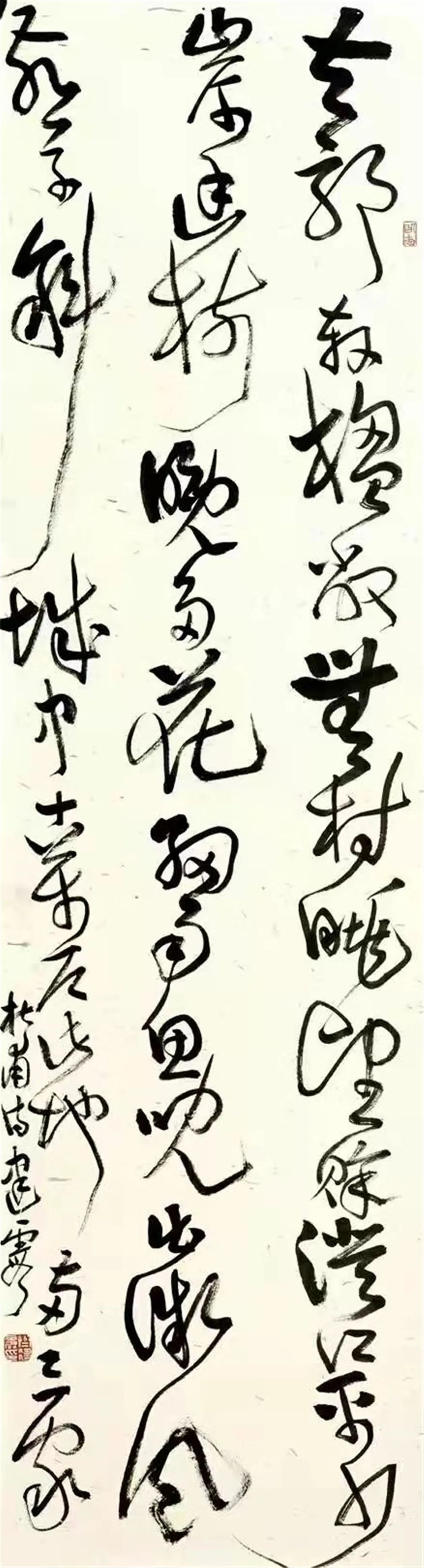 书法是以汉字为载体线条为媒介,以笔墨为形式的抽象艺术。有着细腻精微的外在形式和深沉丰富的精神内涵,我曾临过真、草、隶、篆,却偏爱草书,这大概跟我的生长环境息息相关。想要写件满意的草书作品必须注意笔法、章法、结构。只有通过技法的手段才能最终呈现草书的艺术性即传情达意。用我最近思考的一句"随心所欲,不逾矩"。所以在临摹和创作的过程中把握好“度",才能达到平衡与和谐。