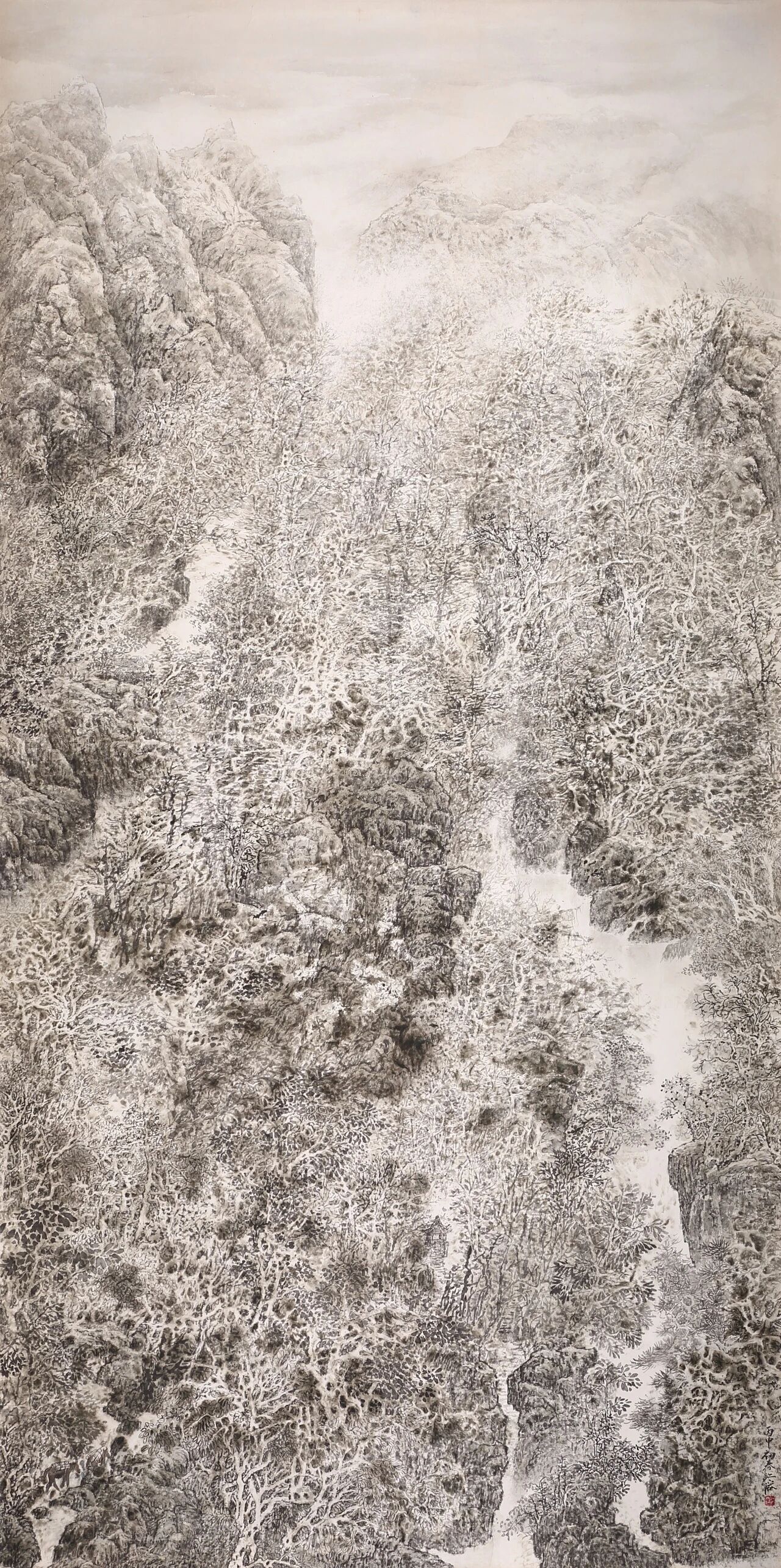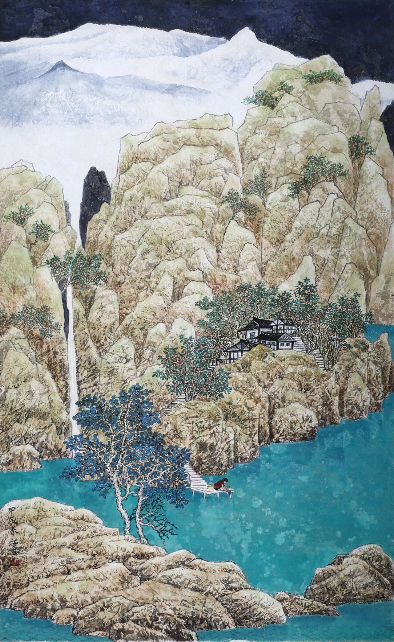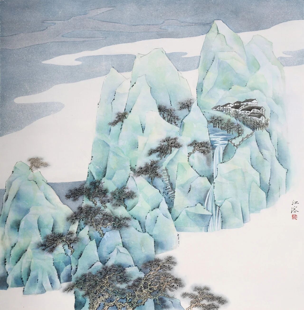 在传统工笔的表达已不能满足江溶对艺术创作的新观念时,他毅然选择更加开阔的艺术手法去传递内心感受,转而投身山水的营构。江溶曾言,自己往往在创作过程中以“阶段性否定”为驱力,每一次背离都不是割裂,而是如同沿着螺旋阶梯的盘旋上升,在舍弃与回望之间拓展新的维度。江溶在艺术生涯的中期转向山水,便是由精微而趋阔大,由工笔之谨严而赴写意之逍遥。