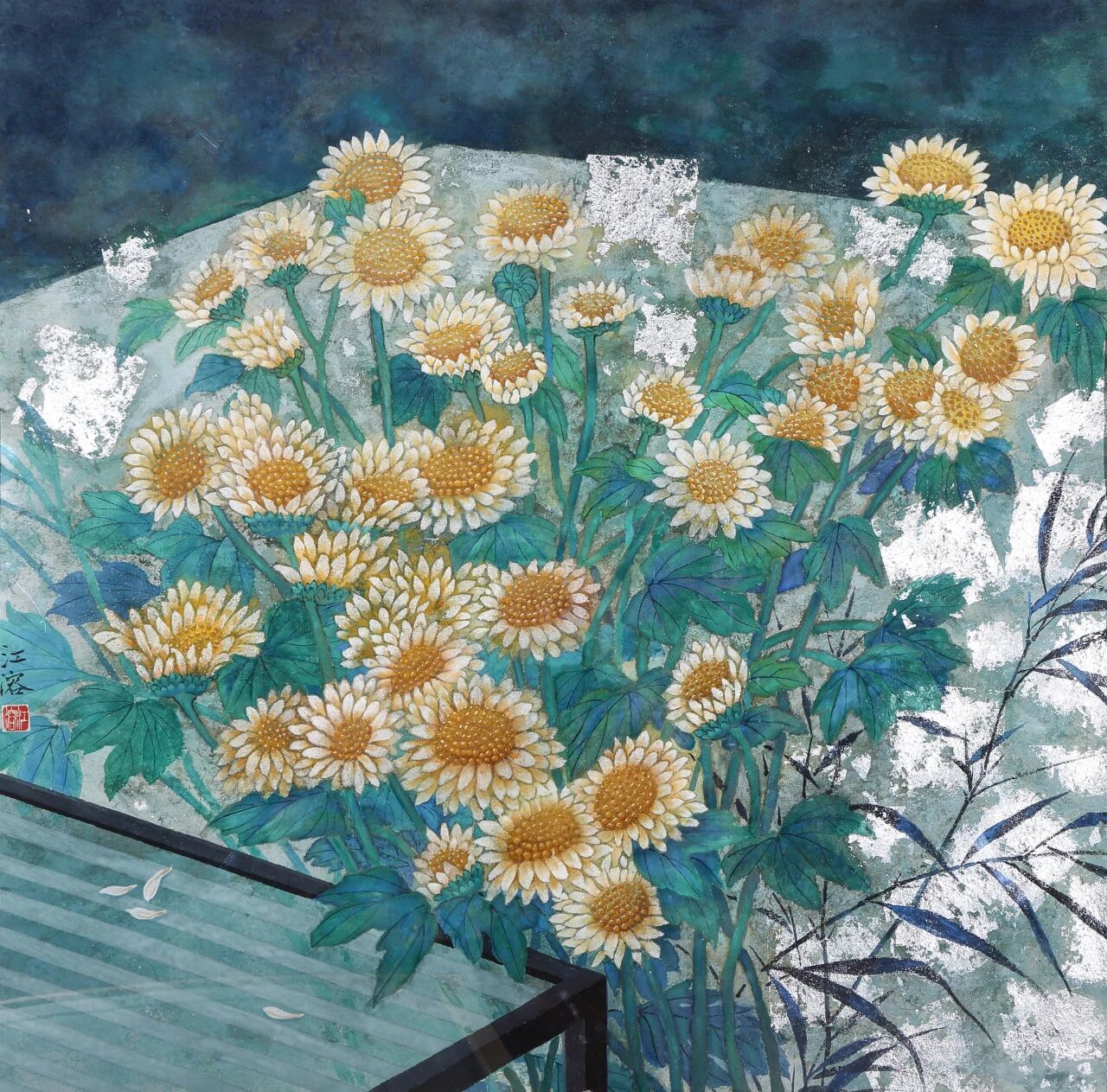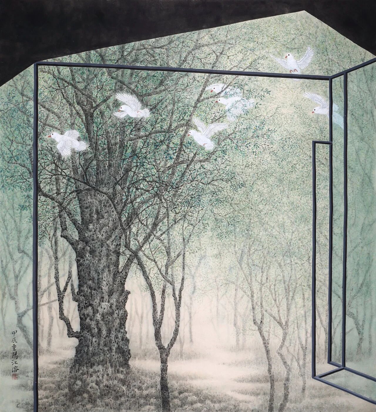 江溶在艺术实践中一向秉持阶段性转向的路径:从工笔花鸟到山水,每一次转换都既是对过往的暂时否定,也是更高层次的递进。正因如此,他对中西艺术传统皆怀有兼容并蓄的眼光,无论宋元笔墨的精微,抑或现代主义的构成思维,都成为他思考和吸纳的对象。及至近年,他的创作愈加凸显出多元交融的特质,江溶进入融汇与自觉的境界。其工笔新作,既不囿于传统程式,又不流于西方移植,而是以开放胸襟,博采众长。画面之中,既有工笔花鸟的温润隽永,又融入西方构成的空间意趣,更辅以岩彩贴箔的材料实验,使画面在光影流转间呈现出富于层次的辉映效果,既延续古代绘画的华丽传统,又展现当代视觉的斑斓质感。他将几何分割与画面秩序感潜入工笔骨架之中,以现代构成的观念拓展工笔画的空间意趣,使作品在细致与宏观之间形成张力。