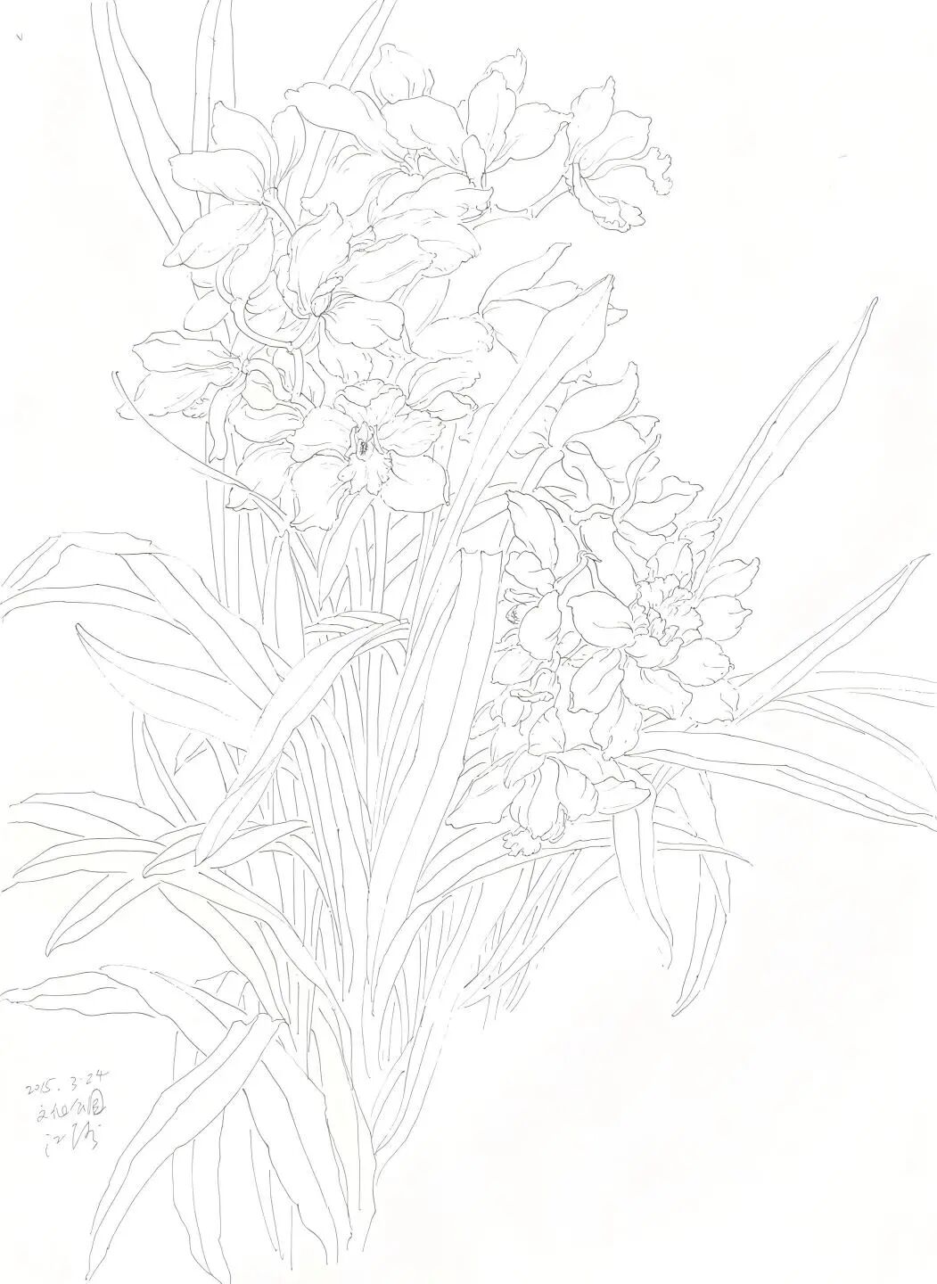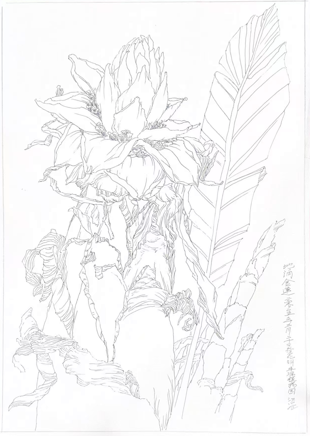 江溶五十余年艺术生涯中的写生小稿,是其创作生命的源泉与底色。尺素之间,既有早年工笔临摹的虔诚,也有中期花卉线描的精研,乃至晚近山水写生的赋色点染。这些写生小稿尤为动人之处在于,其往往出自旅途中的偶然邂逅:一枝迎风的野菊,一条奔腾于溪涧的流水,一道云烟掩映的山脊。江溶并不急于将其编织为完整的构图,而是以寥寥数笔,捕捉那一瞬的呼吸与灵光。在笔与墨的交汇处,物象不再是“客观存在”,而转化为心境的投射,带有一种未经修饰的真切与鲜活。这些稿本,犹如“雪泥鸿爪”,印证他由解析物象至意象抒怀的转变轨迹。