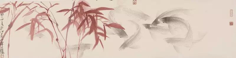 随处可见郭汝愚画作中留白的技艺甚赞。他的《红竹鲤鱼》,画鱼决不画水,通过留白与着墨相对,使神韵游离纸上。如他所言,“妙在似与不似之间”不画水却分明看到了水,让人真切地感受到了鱼的活泼灵动。