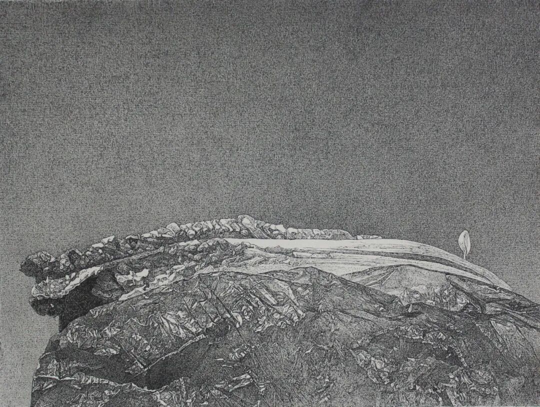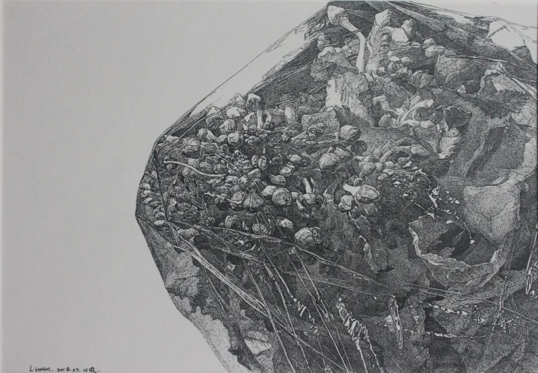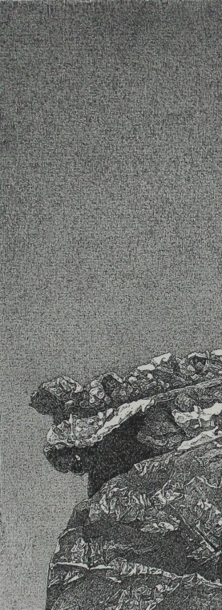 在艺术语言上,以线条作为主要语言,将线条一遍一遍地进行叠加,在叠加的过程中体会硬笔与纸张之间的微妙关系,在叠加的过程中透露出形象姿态和画面关系的营造。细碎的用笔,通过同向内旋式的有序铺排,不知是山脉、巨岩,还是云团或者雾霭……,图像常常是对于生命、宇宙、天地、山水以及个体性灵的似是而非、“意在言外”的感悟和自觉,自然而然地形成了一种强悍之势和内在张力。不同的人由于视觉经历的不同,会产生不同的视觉解读结果,在这个不可确定的物象背后,它既是一种能量,也是一种精神,一种无时无刻地在暗地冲撞着观看者神经的巨大能量和精神。