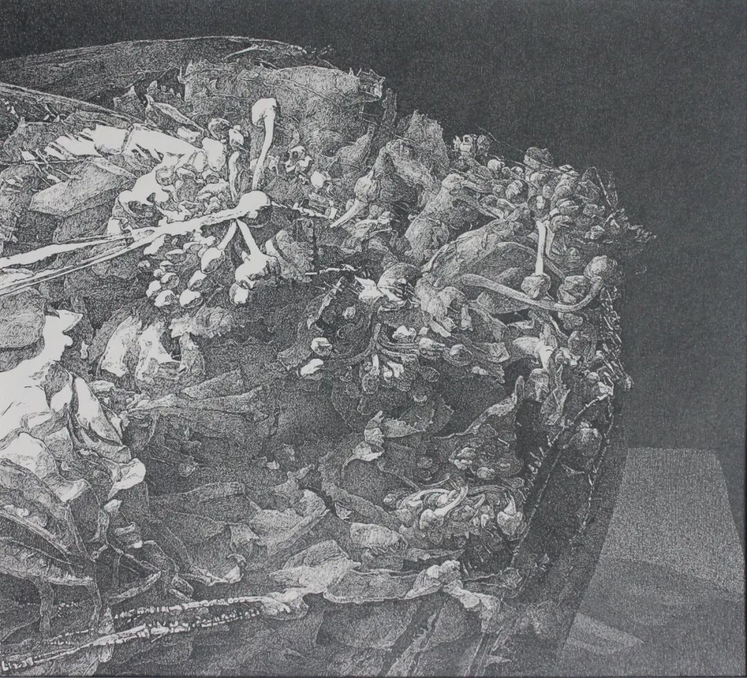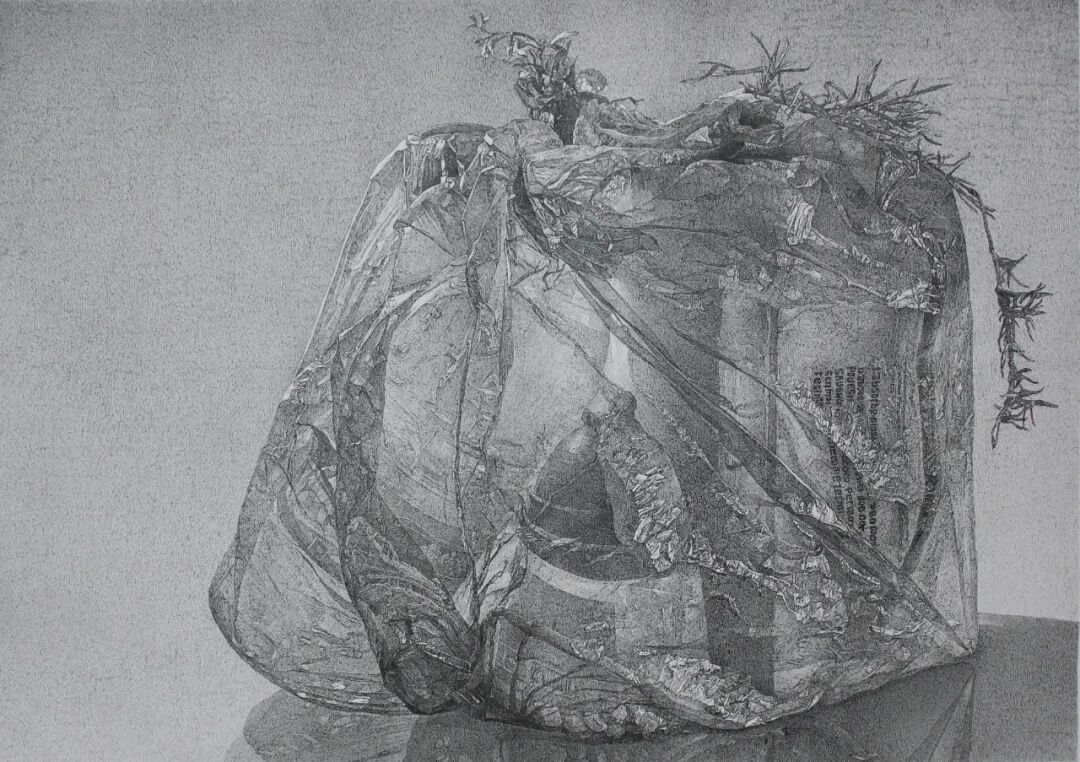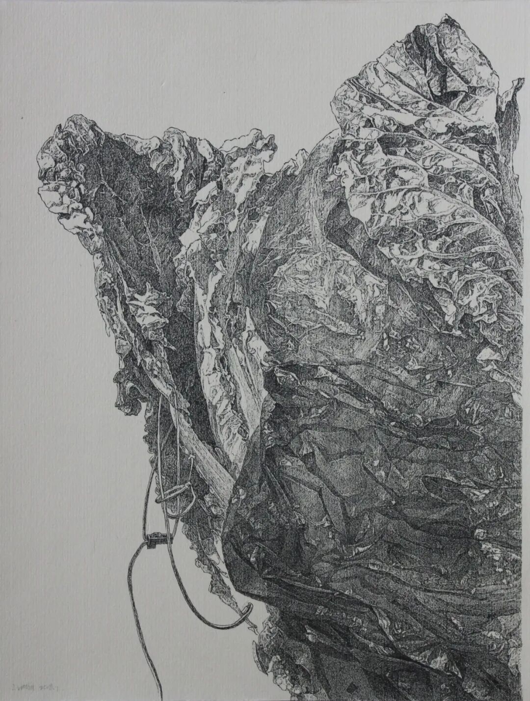 在《呼吸》系列的钢笔画创作中,主要以被保鲜膜包裹着的蔬菜作为载体,以蔬菜作为生命体的代表,当生命体生活在一个被包裹着的空间,甚至是一个密闭的空间中时,会是怎样一种状态呢?状态是生命本身的绚烂与被包裹的窒息并存。