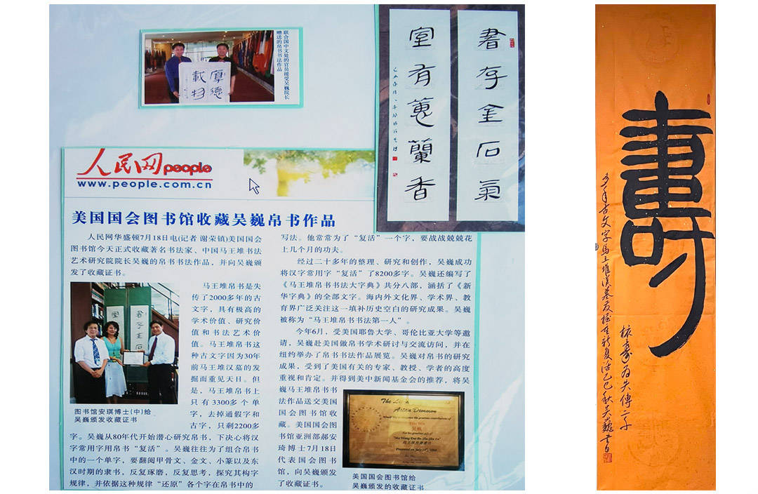 吴君矢志数十弦, 积智凝心研大典。简帛墨痕藏浩瀚,小众珍章映长天。书中宪典师且尊,神圣地位人共瞻。四巨册出惊四海,简帛大典清华传。“敦煌虽在地中华,敦煌学扬海外夸”。历史悲剧不重演,吴巍壮志照天下。简帛字典心血凝,八千单字映朝霞。简帛墨香根夏华,法承精髓吾邦探。古韵遗风岁月镌,老枝萌蕊焕新妍。当代艺林添绮绣,艺舟破浪耀宇寰。 吴巍巨著耀尘寰耀宇环,炎黄傲世梦魂牵。简帛豪书遗岁湍,华章璀璨耀四安。