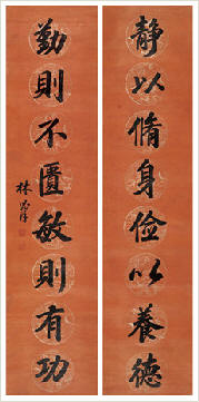 林则徐(1785-1850),字少穆,号元抚石麟竢村老人,卒谥文忠。福建侯官(今福州)人。清代名臣。出身士大夫家庭。嘉庆进士,入翰林院。嘉庆二十五年(1820)起,曾在浙江江苏湖北河南山东等地任职,办理过军政漕务盐政河工水利等事,重实际调查,干练有绩,由道台迁升至巡抚。诗宗白居易。善书法。其书法具体欧阳询,尤工楷书,出联自然关合,取势端庄稳健,绝无矫揉造作,柔中含刚,宽博疏朗。