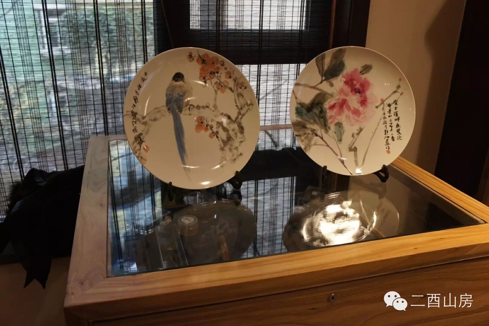 现场展示了一套“郭汝愚艺术瓷盘”,分别是:喜鹊梅花、牡丹、芙蓉鲤鱼、桃花双鸟,